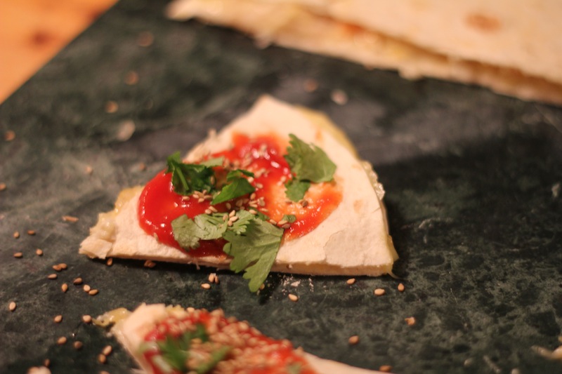 Sedan skar jag upp quesadillan i mindre bitar. Strök på chilisås och toppade med färsk koriander och sesamfrön. Så ljuvligt gott!