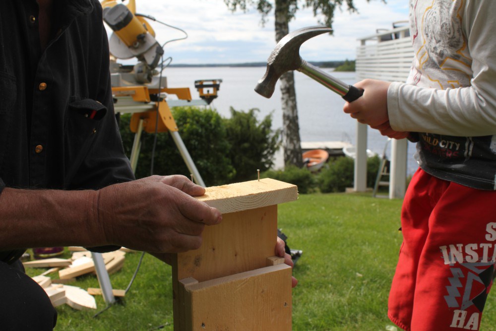 Att bygga tillsammans med barnen är himla kul. Men det roliga slutar inte där. När holken är klar är det dags att välja en plats där holken ska hänga. Roligast är ju att hänga den i närheten där man bor, så man kan gå och kolla om det är något djur som flyttat in. Vi byggde en fladdermusholk, och barnen var eld och lågor över att man kunde se på “bajshyllan” om någon flyttat in eller inte. Bajs på hyllan betyder alltså att en eller flera fladdermöss huserar i vår holk. Förutom fladdermusholk kan man t ex bygga fågelholk eller insektshotell.